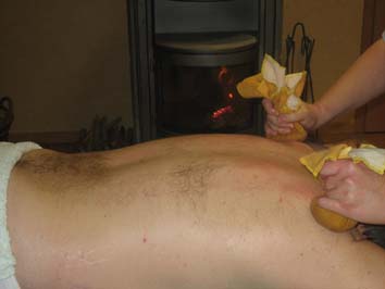 Massiert wird mit kleinen Beutelchen, die mit heilenden Kräutern wie Kamille, Melisse, Zitronengras und Orangenblüten gefüllt sind.