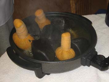 Diese Stempel werden über heißem Wasserdampf erwärmt. Ähnlich wie bei der Teezubereitung kann sich der wohltuende Duft frei entfalten und die